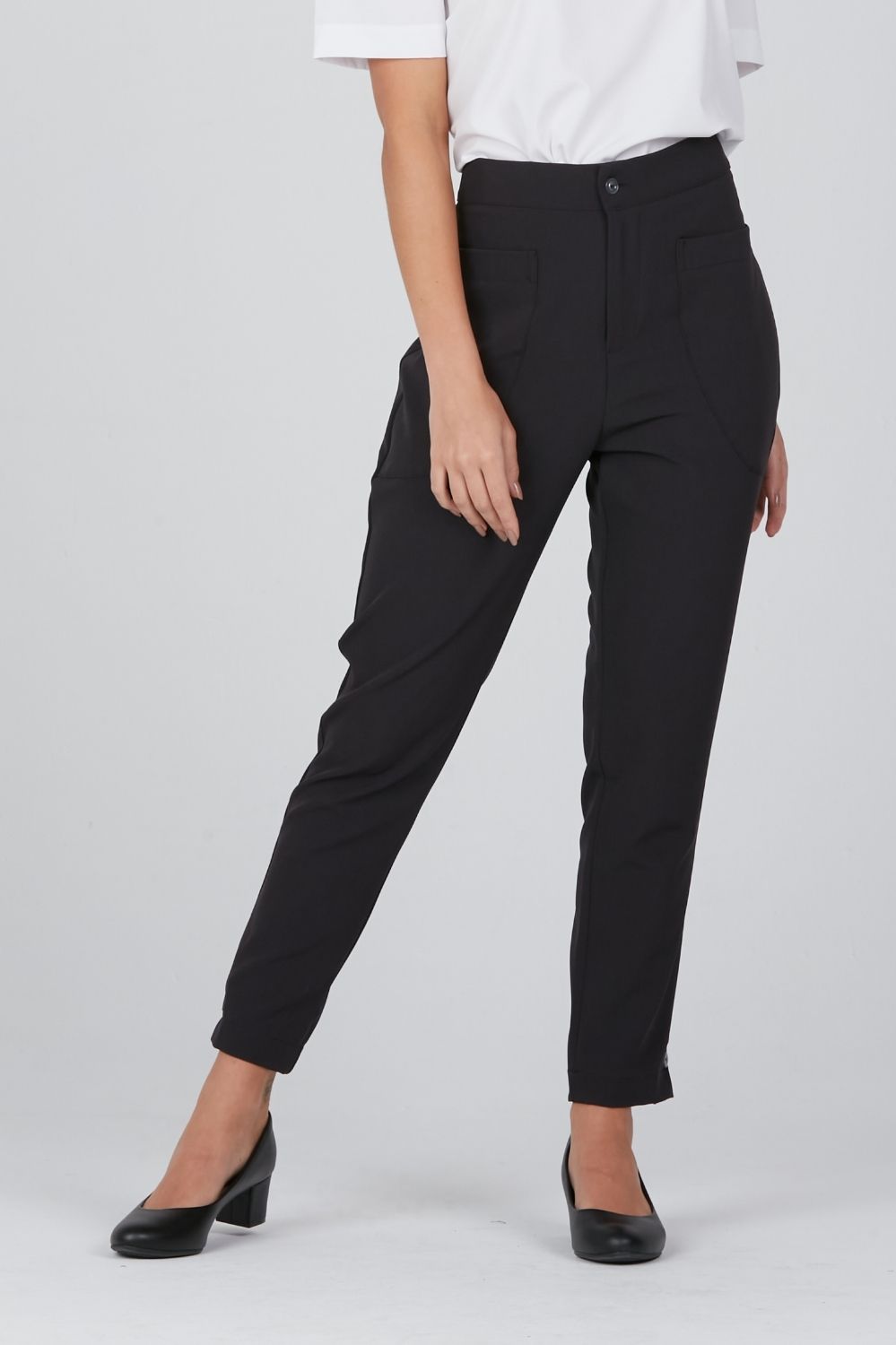 Calça social feminina Paula Furlan spandex, bolso frontal aplicado e punho com botões.