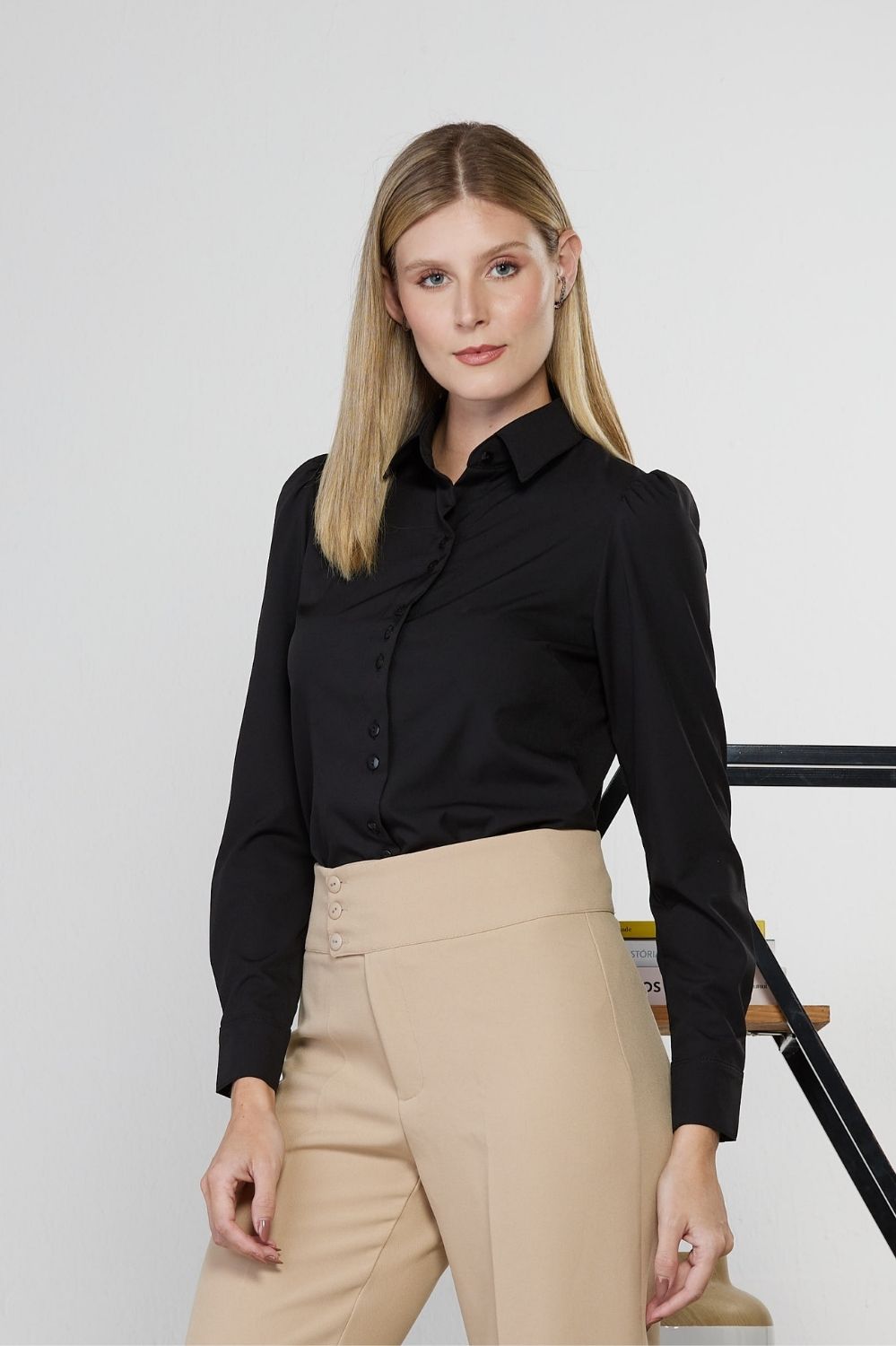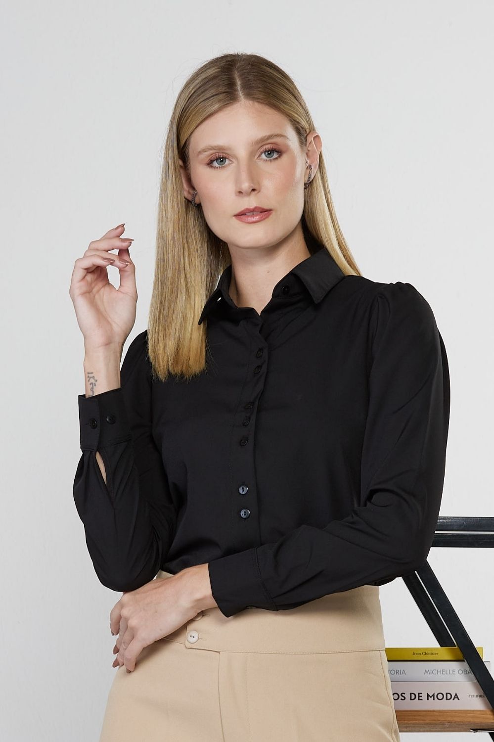 Camisa feminina Lara microfibra com elastano, manga longa com leve franzido, gola tradicional, fechamento frontal por botões e punho com botão.