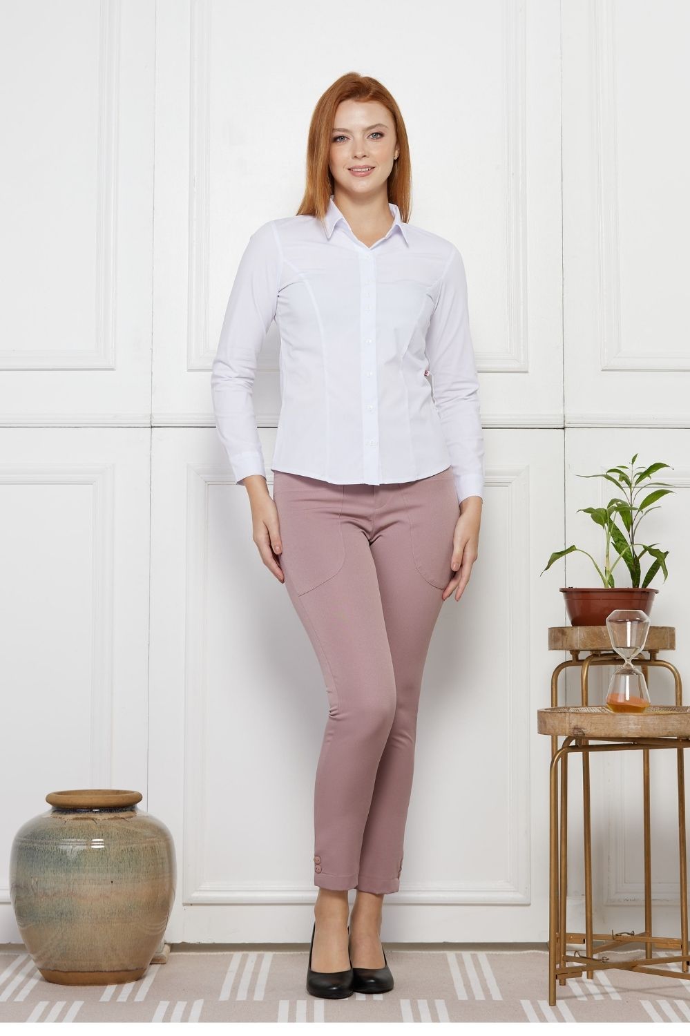 CAMISA FEM CASTANHA TRIC/STRECH MC BCO/LISO-BCO/MARINHO