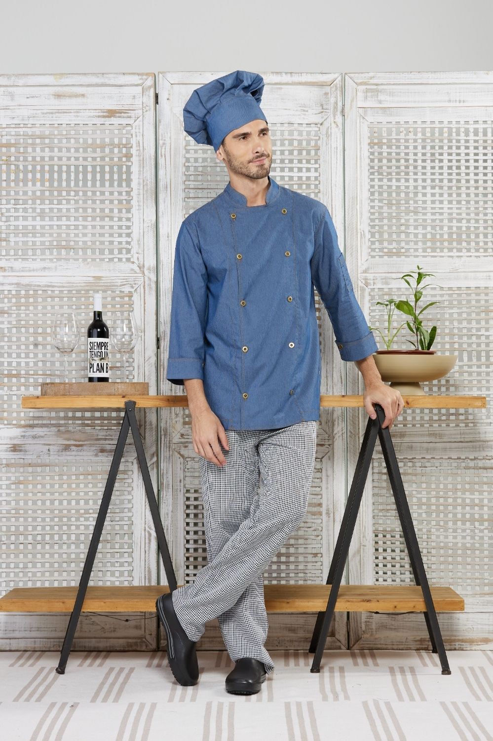 Dólmã cozinheiro masculina Portugal jeans leve, gola padre, fechamento frontal com botões duplos, mangas 3/4 com acabamento dobrável e bolso funcional na manga esquerda.